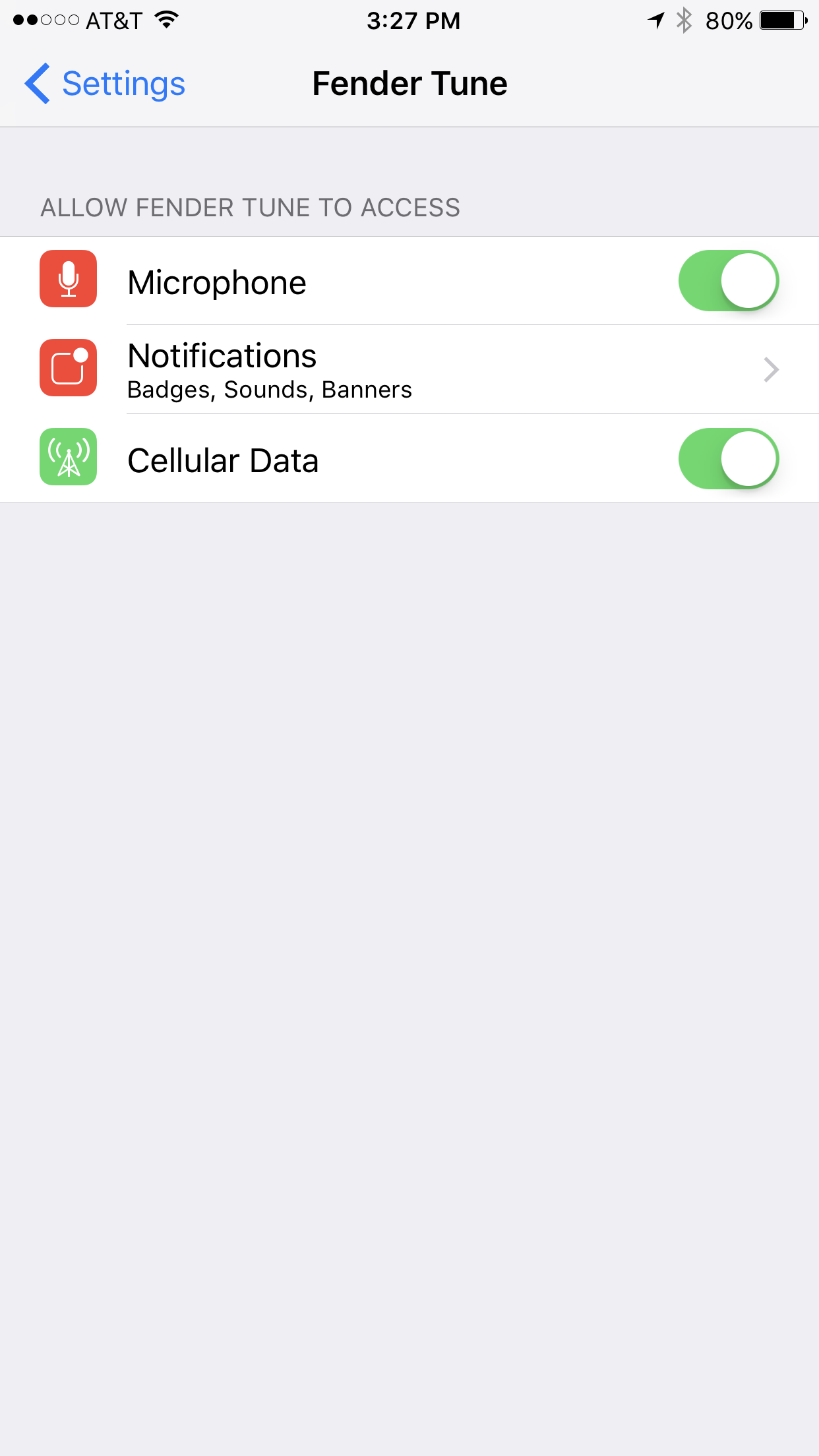 - You should see the option to Allow Fender Tune to access with Microphone listed below with a toggle next to it. Make sure it's toggled to on (so it displays as green).